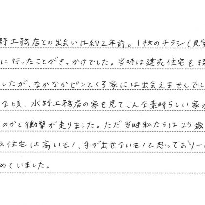 水野工務店との出会いは約2年前。1枚のチラシから見学会を見に行ったことがきっかけでした。当時は建売住宅を探していましたが、なかなかピンとくる家には出会えませんでした。そんな頃、水野工務店の家を見てこんな素晴らしい家があるのかと衝撃が走りました。ただ当時私たちも若く、注文住宅は高いモノ、手が出せないモノと思っており一時は諦めていました。