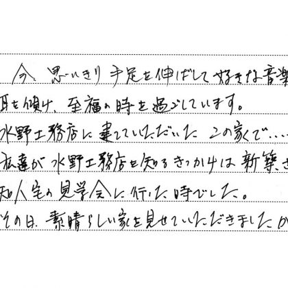 今、思いきり手足を伸ばして好きな音楽に耳を傾け、至福の時を過ごしています。水野工務店に建てていただいたこの家で…。