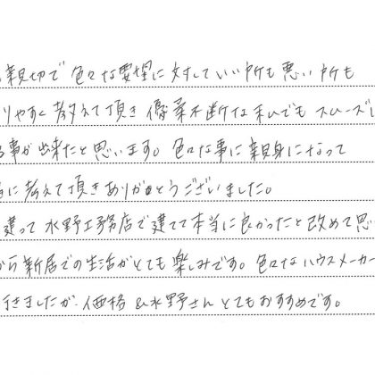 とても親切で色々な要望に対応していい所も悪い所もわかりやすく教えて頂き優柔不断な私でもスムーズに建てることが出来たと思います。色々な事に親身になって一緒に考えて頂きありがとうございました。家が建って水野工務店で建てて本当によかったと改めて思いました。これから新居での生活がとても楽しみです。色々なハウスメーカーを見に行きましたが価格&水野さんとてもおすすめです。