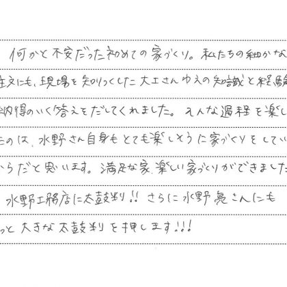 何かと不安だったはじめての家づくり。私たちの細かな注文にも、現場を知りつくした大工さんゆえの知識と経験で納得のいく答えを出してくれました。そんな過程を楽しめたのは、水野さん自身もとても楽しそうに家づくりをしていたからだと思います。満足な家、楽しい家づくりができました。水野工務店さんに太鼓判!!さらに水野亮さんにももっと大きな太鼓判を押します!!!
