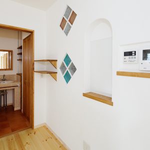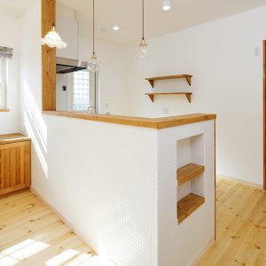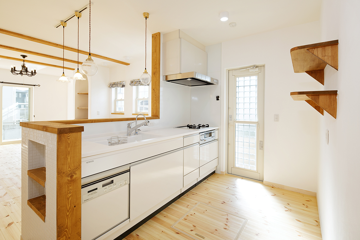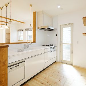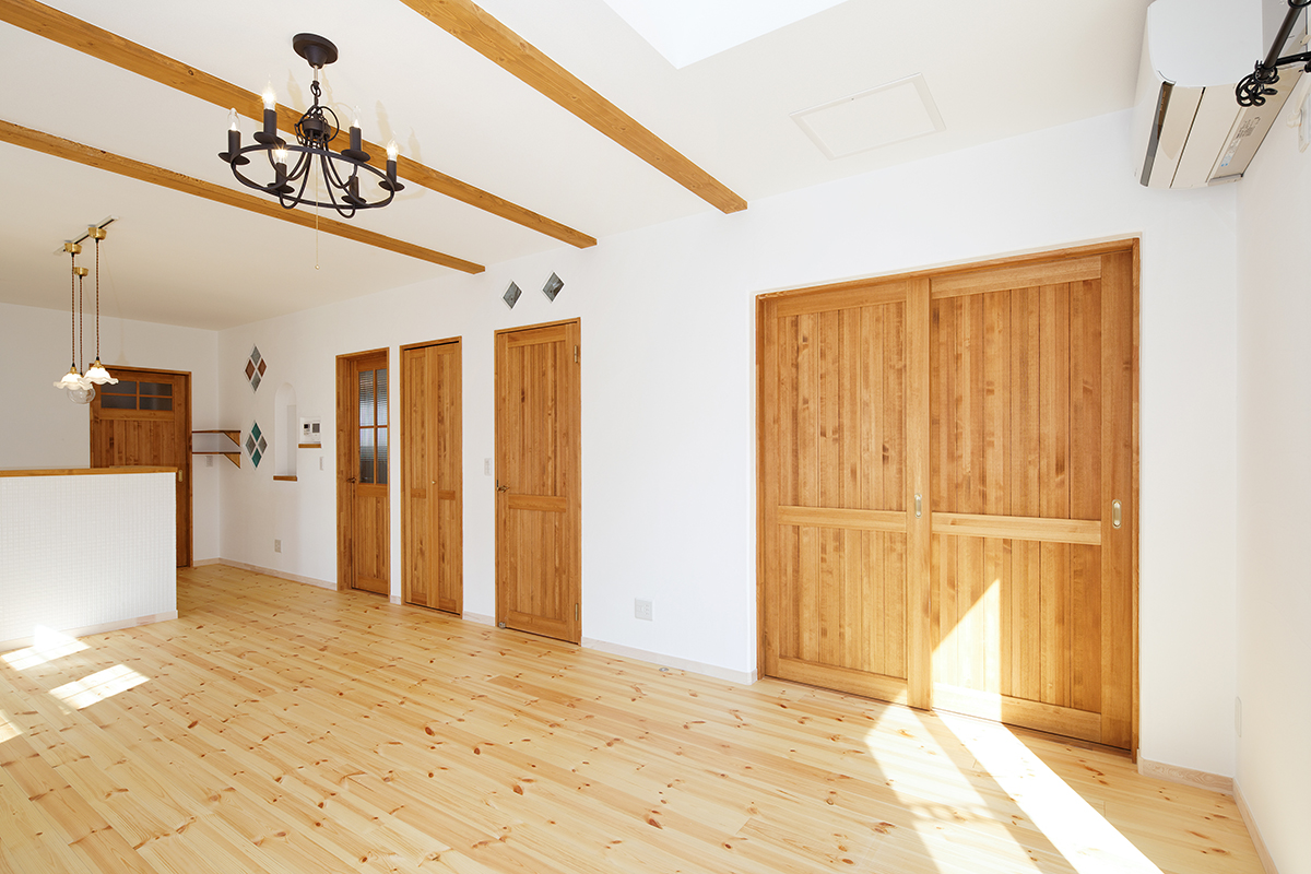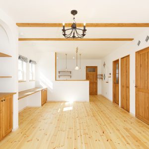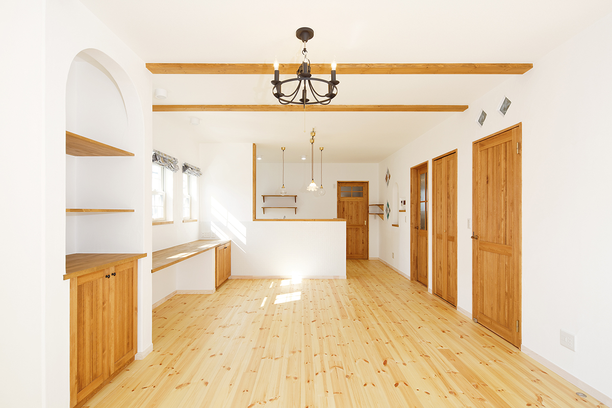 カーサ・カリーナの特徴の南欧風のアンティークな雰囲気キッチンやリビング、照明などひとつひとつにこだわりました。見た目だけでなく、素材にもこだわり、無垢材やテラコッタ、漆喰を使ったナチュラルテイストの家は人にも優しい。長い年月を経たような使用感のある木に真っ白な壁、そのコントラストは新しいけど古いような不思議な感覚のお家です。