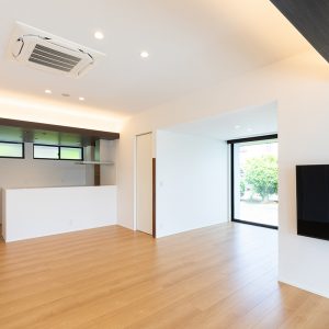 真っ平らな屋根と大きく張り出した軒、日本の住宅の良さにモダンな雰囲気を加えた新しいスタイルのシンプルモダンな平屋はどこから見ても洗練されていて美しい。部材のひとつひとつにもこだわったやわらかで美しい平屋です。