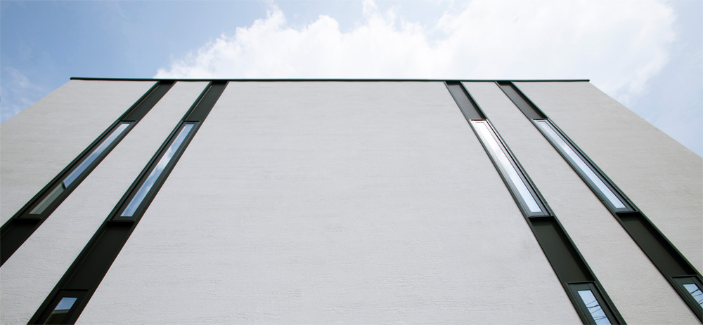 外観にアクセントを加えるデザイン的役割以外にも、外観の美しさを維持するという重要な役割があります。通常の住宅では避けることの出来ない窓周りの雨だれ。スリットラインは雨水を板金凸部分を伝って下へ流すことで、外壁への雨だれの汚れを防止しているのです。