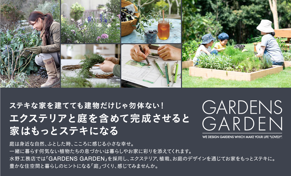 「外構も含めて完成された家づくり」をモットーに季節を感じ、自然を感じながら居心地の良さをより深いものに。家と暮らし方に合った庭をご提案する「ガーデンズガーデン」を取り入れた庭をご覧いただけます。