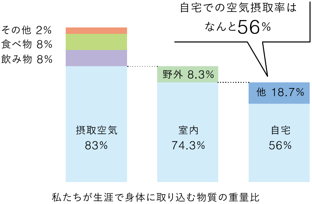 私たちが生涯で身体に取り込む物質はほとんどが「空気」です。その中の56%が自宅で取り込まれます。これだけたくさんの空気を取り込んでいるのに自宅の空気環境は本当にそのままで大丈夫でしょうか。