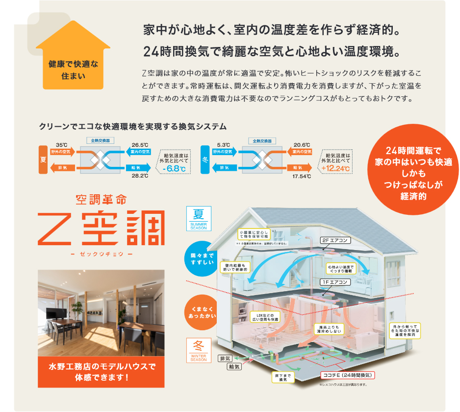より快適で暮らしやすい家であってほしいから、暑い夏も寒い冬も外気温に左右されず、室内の空気が綺麗でいつでも過ごしやすい環境のために、窓を開けるより清々しい、空気環境を整えます。