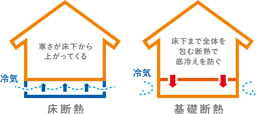 建物最下部の基礎に断熱材を設置し、基礎からの熱の出入りを防ぐことで床下の温熱環境をコントロールするための、床下に断熱材を入れる『床断熱』に比べ気密性が高く暖かい住宅を作るのに最適です。