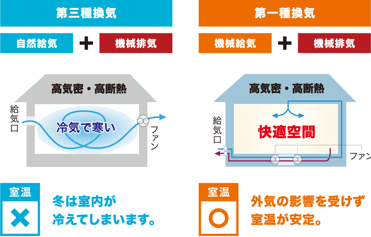 第三種換気は、外気をそのまま室内に取り入れるため、暑さ寒さに直接影響します。一方、第一種換気は、熱交換を行うことで、外気温の影響を受けずに空気をキレイにすることが出来ます。