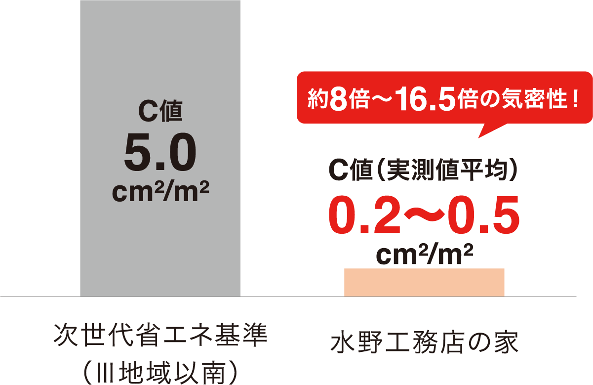 水野工務店ではより気密性の高い住宅にするため、すぐれた断熱材のアクアフォームを採用したり、プレセッター加工でより精確な素材の制作、それらを最良の状態に施工する技術力を高めることで「C値」の次世代エネルギー基準である5㎠/㎡を上回る0.3~0.5㎠/㎡(実測値平均)をマーク。高い技術力で気密性の高い家づくりを証明するために全棟気密測定を実施しています。