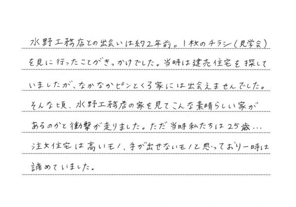 水野工務店との出会いは約2年前。1枚のチラシから見学会を見に行ったことがきっかけでした。当時は建売住宅を探していましたが、なかなかピンとくる家には出会えませんでした。そんな頃、水野工務店の家を見てこんな素晴らしい家があるのかと衝撃が走りました。ただ当時私たちも若く、注文住宅は高いモノ、手が出せないモノと思っており一時は諦めていました。