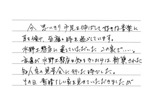 今、思いきり手足を伸ばして好きな音楽に耳を傾け、至福の時を過ごしています。水野工務店に建てていただいたこの家で…。