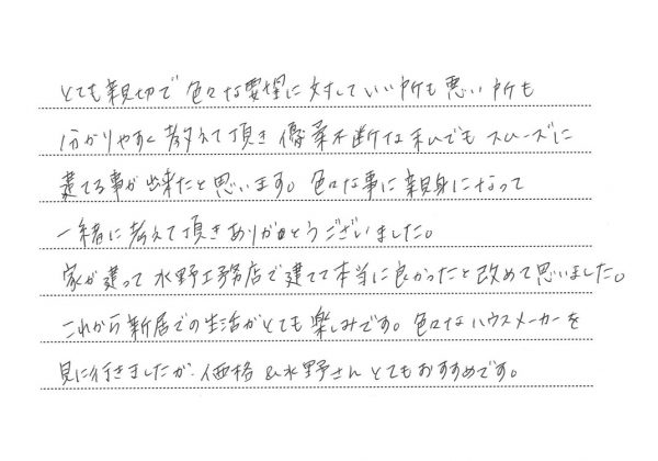 とても親切で色々な要望に対応していい所も悪い所もわかりやすく教えて頂き優柔不断な私でもスムーズに建てることが出来たと思います。色々な事に親身になって一緒に考えて頂きありがとうございました。家が建って水野工務店で建てて本当によかったと改めて思いました。これから新居での生活がとても楽しみです。色々なハウスメーカーを見に行きましたが価格&水野さんとてもおすすめです。