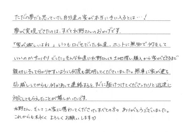 夢が実現できたのは、すべて水野さんのおかげです。「家が欲しいよね」いつも口ぐせだった私たち。ホントに無知で何をしていいのかサッパリでした。そんな私たちに水野さんは土地探し、購入から家ができるまで親切にそして分かりやすいように何度も説明してくださいました。無事に家が建ち、引越ししてからも何かあって連絡するとすぐに駆けつけてくださったりと迅速に対応してもらえたことが嬉しかったです。