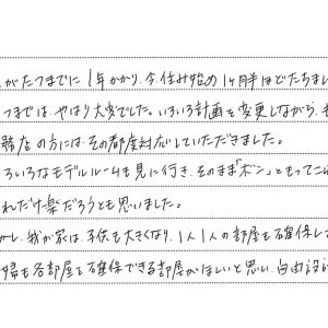 約1年住んで一番うれしかったことは夏は涼しく、冬は暖かくとても住みやすい家で家族みんな満足しています。これからも、みんなが笑顔になる家をどんどん作ってください。水野社長、事務の方、大工さん、家づくりに携わってくれた方みなさんに感謝しています。本当にありがとうございました!!