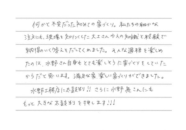 何かと不安だったはじめての家づくり。私たちの細かな注文にも、現場を知りつくした大工さんゆえの知識と経験で納得のいく答えを出してくれました。そんな過程を楽しめたのは、水野さん自身もとても楽しそうに家づくりをしていたからだと思います。満足な家、楽しい家づくりができました。水野工務店さんに太鼓判!!さらに水野亮さんにももっと大きな太鼓判を押します!!!