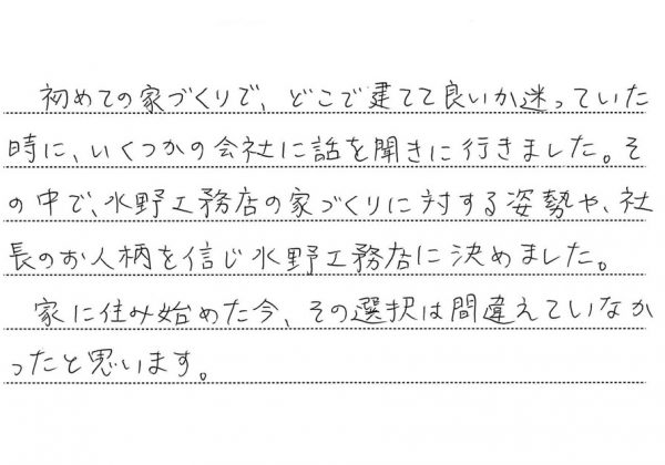 初めての家づくりで、どこで建てて良いか迷っていた時に、いくつかの会社に話を聞きに行きました。その中で、水野工務店の家づくりに対する姿勢や、社長のお人柄を信じ水野工務店に決めました。