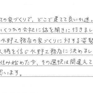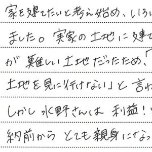 設計に伴ってこちらの話しもしっかり聞いて頂き、悩み等にも、お忙しいところ必ず時間を作って頂き、対処して頂きありがとうございました。